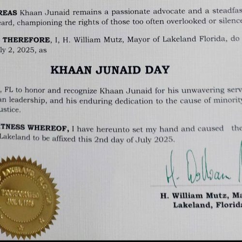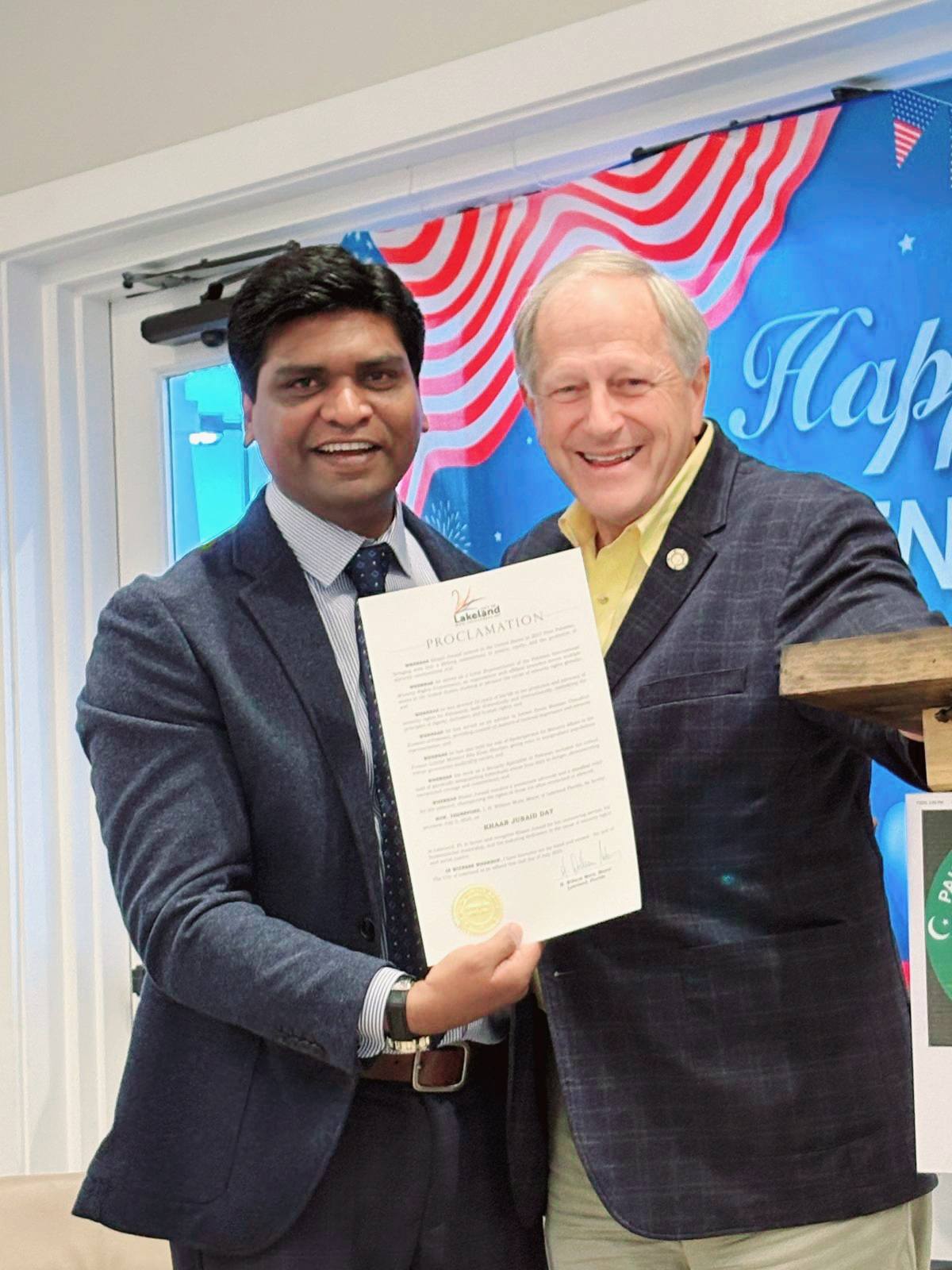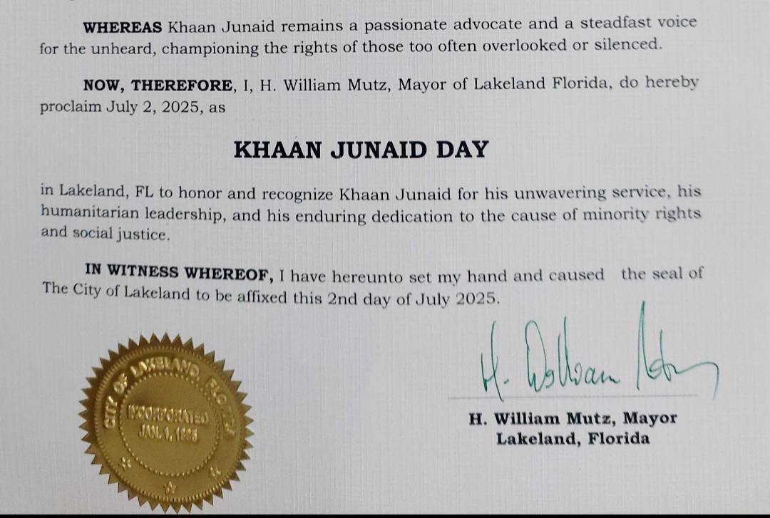 4th July Celebrations by PMRC in Florida Lakeland. Where City Mayor Lakeland Mr. Mutz was special guest & other Republican Congress candidates. Mayor of City announced a big honor for Khaan Junaid Chairman PMRC 2n July of The year will be KhaanJunaidDay. It is commitment, struggle, devotion of Mr. khaan’s work. City government officially declare and sealed singed the Proclamation document in honor of Mr. khaan.