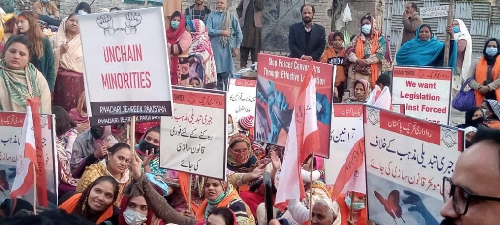 Christians, Hindus and other minority communities protested in front of Lahore Press Club against forced conversion of religion of mino...
